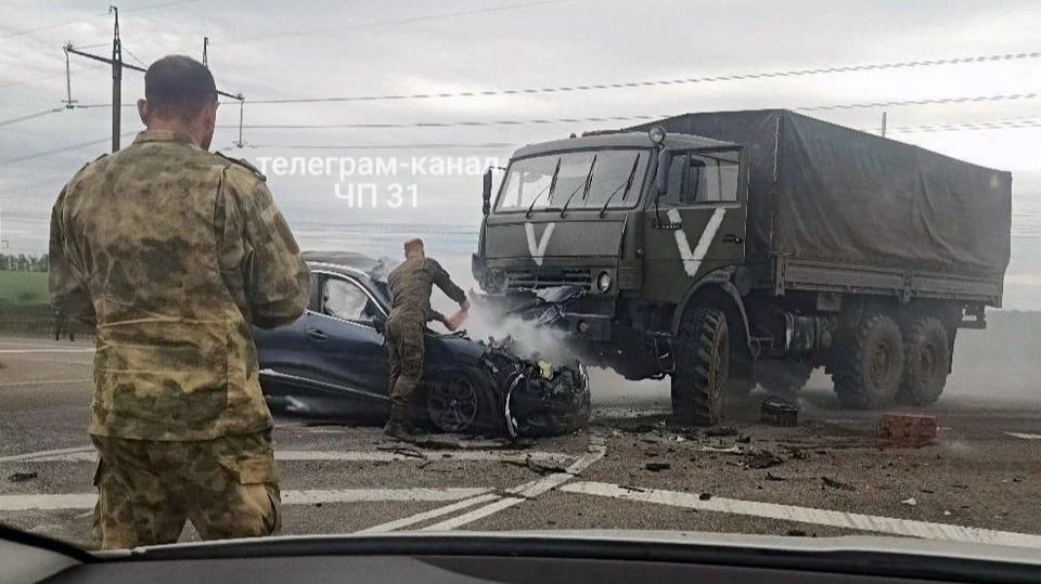 Телеграм-канал «ЧП 31» опубликовал несколько видео очевидцев ДТП. На них можно заметить, что на грузовике цвета хаки нарисованы большие буквы V.