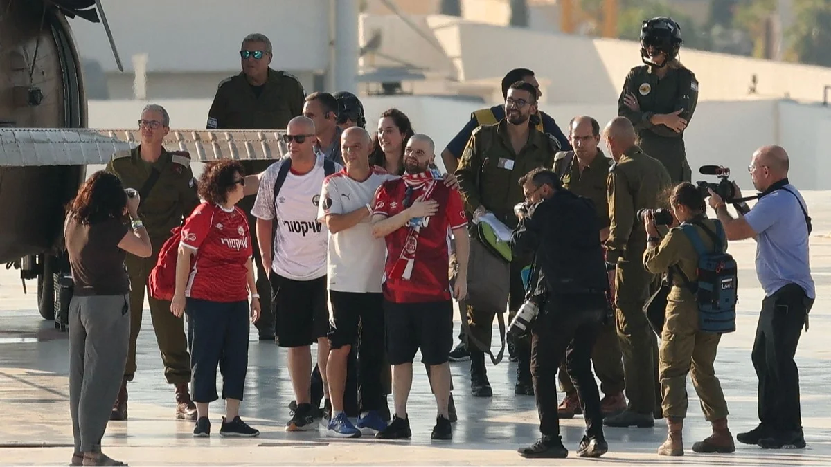 Семьи вернувшихся заложников Матана Ангреста, Нимрода Коэна, Омри Мирана и Эйтана Хорна выступили с заявлениями для прессы в больнице «Ихилов» в Тель-Авиве. Они держали плакаты с фотографиями погибших заложников, тела которых до сих пор удерживаются в секторе Газа.