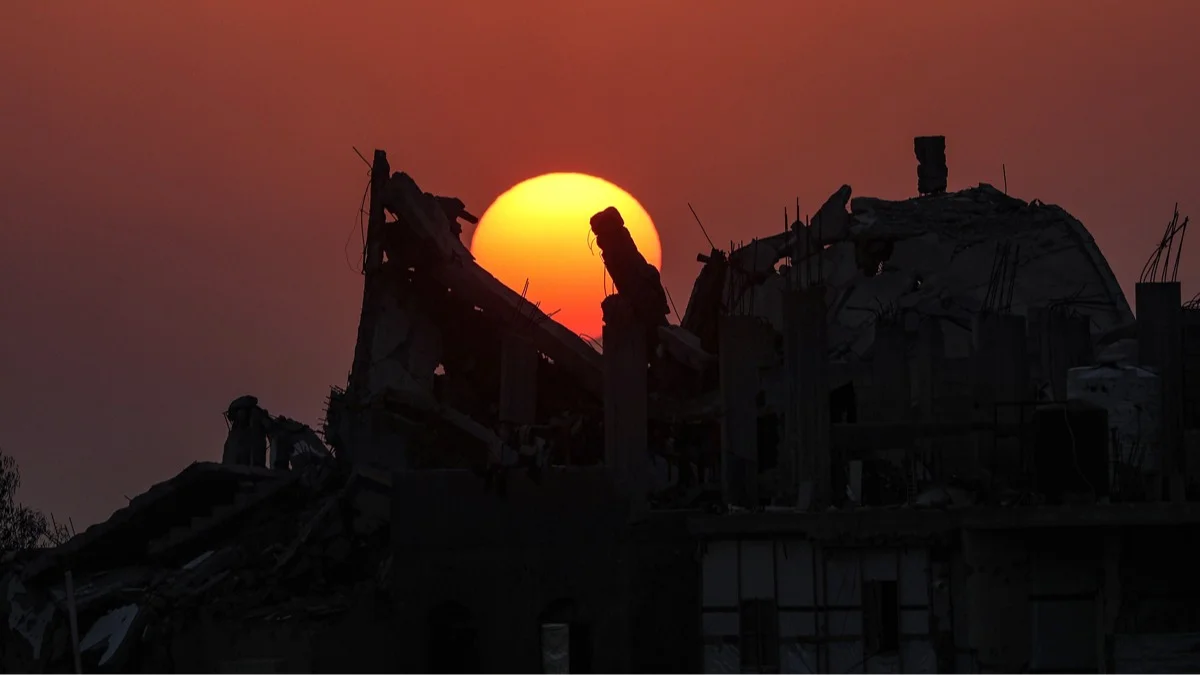 Солнце садится за руинами разрушенных зданий в северной части города Газа, Сектор Газа, 18 ноября 2025 года. Фото: Mohammed Saber / EPA
