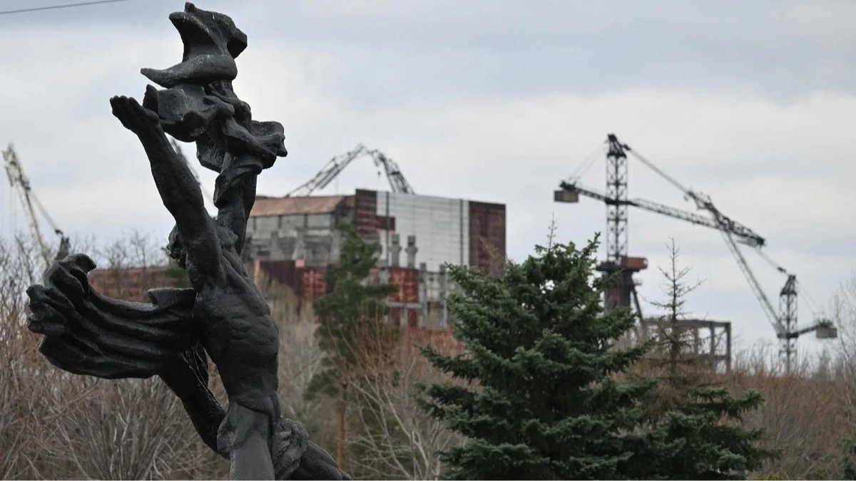 Памятник Прометею, установленный еще во времена строительства Чернобыльской АЭС, на фоне промышленной площадки станции, Украина, 9 апреля 2026 года. Фото: Genya Savilov / AFP / Scanpix / LETA
