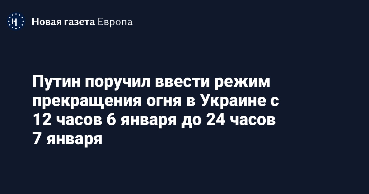 Президент России Владимир Путин поручил ввести режим прекращения огня в Украине с 12:00 мск 6 января до 24:00 7 января, сообщает ТАСС со ссылкой на Кремль.