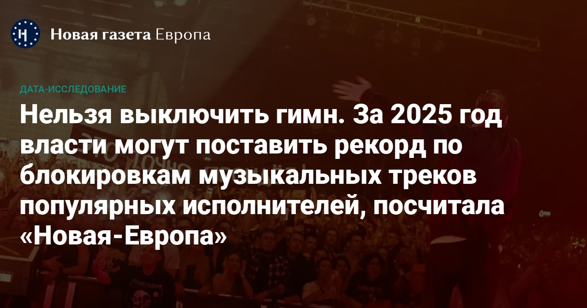 Неделю назад суд признал экстремистской песню «Выключите гимн» группы «Порнофильмы», — в ней суд услышал призывы к совершению агрессивных и насильственных действий, в том числе в отношении органов власти. Всего за 2024 и неполный 2025 год по требованию госорганов с платформ удалено почти 80 треков популярных исполнителей, выяснила «Новая-Европа». Среди поводов для запрета песен — не только «фейки» и протесты против власти, но и «нетрадиционные сексуальные установки».