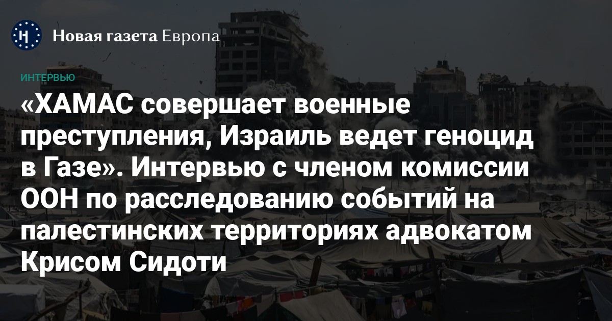 «Новая газета Европа» побеседовала с соавтором доклада — австралийским юристом, бывшим комиссаром по правам человека и одним из наиболее авторитетных экспертов по международному праву Крисом Сидоти. На протяжении последних четырех лет, еще до нападения ХАМАС на Израиль 7 октября 2023 года, Сидоти работал в составе независимой международной комиссии ООН по расследованию событий на палестинских территориях и в Израиле. Сегодня мы поговорили с ним о выводах, к которым он пришел вместе с коллегами, а также о критике доклада.