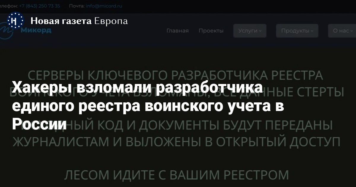 Анонимная хакерская группировка взломала серверы компании «Микорд», которая является ключевым разработчиком единого реестра воинского учет, сообщил глава правозащитного проекта «Идите лесом» Григорий Свердлин.