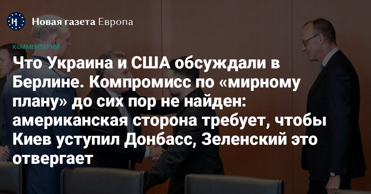 На переговорах в Берлине США по-прежнему выдвигают ключевое условие заключения мира: Украина должна уступить Донбасс России. Об этом, как передает The Guardian, сообщило агентство AFP со ссылкой на осведомленный источник. Киев отказывается выполнять это требование Вашингтона. Источник выразил удивление: «Немного удивительно, что американцы занимают позицию россиян по этому вопросу».