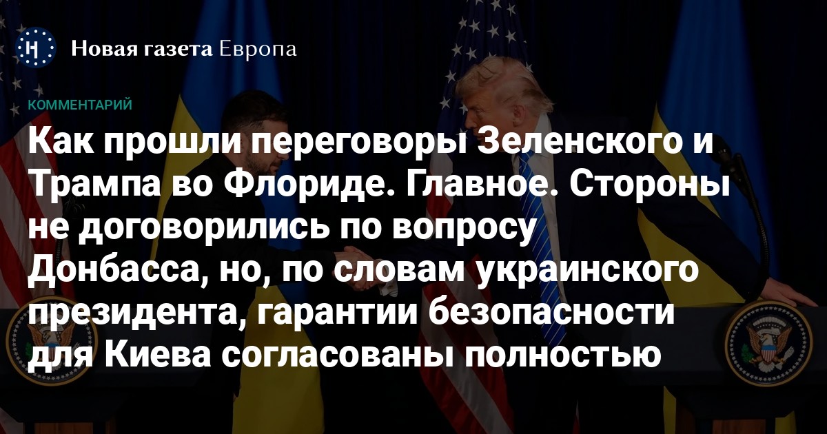 Украинский и американский лидеры Владимир Зеленский и Дональд Трамп в ходе встречи во Флориде не смогли договориться по вопросу Донбасса, но всё равно назвали переговоры «замечательными» и заявили, что согласовали более 90% пунктов мирного плана, включая гарантии безопасности для Украины.