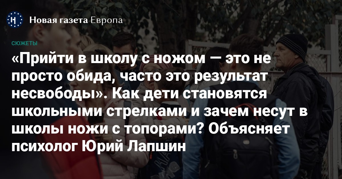 — Это же на самом деле очень тяжелое решение. Очень непросто напасть на кого-то с оружием. Это ломает жизнь самому нападающему. Если человек в какой-то момент решается на это, значит, он до того долго не решался на что-то иное. Например, волосы в зеленый цвет покрасить, кого-то выругать, матом послать. Или он не имеет интеллектуальных и творческих каналов для реализации собственной энергии, собственной субъектности. Так что я думаю, что это может быть и обида, и результат какой-то несвободы.