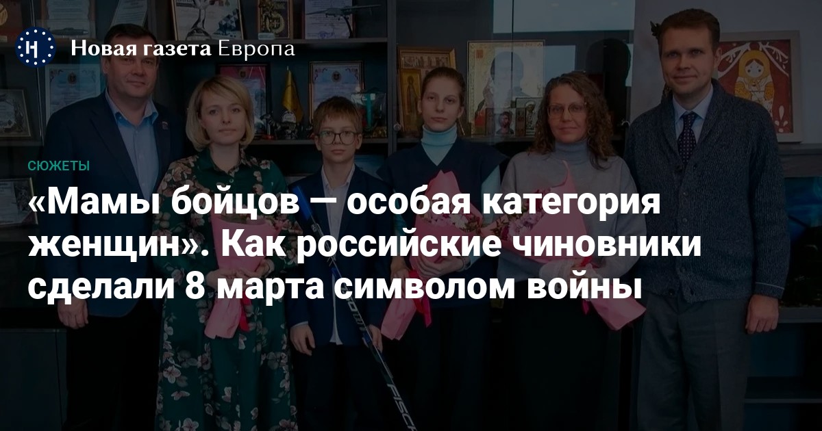 Международный женский день стал символом милитаризма: теперь российские чиновники в первую очередь поздравляют с 8 марта матерей, вдов и жен участников войны, вручают им цветы и подарки. Для «жен и матерей героев» и волонтерок проводятся праздничные концерты. И кажется, что других женщин на праздник не зовут. «Новая газета Европа» рассказывает, как теперь в России празднуют 8 марта.