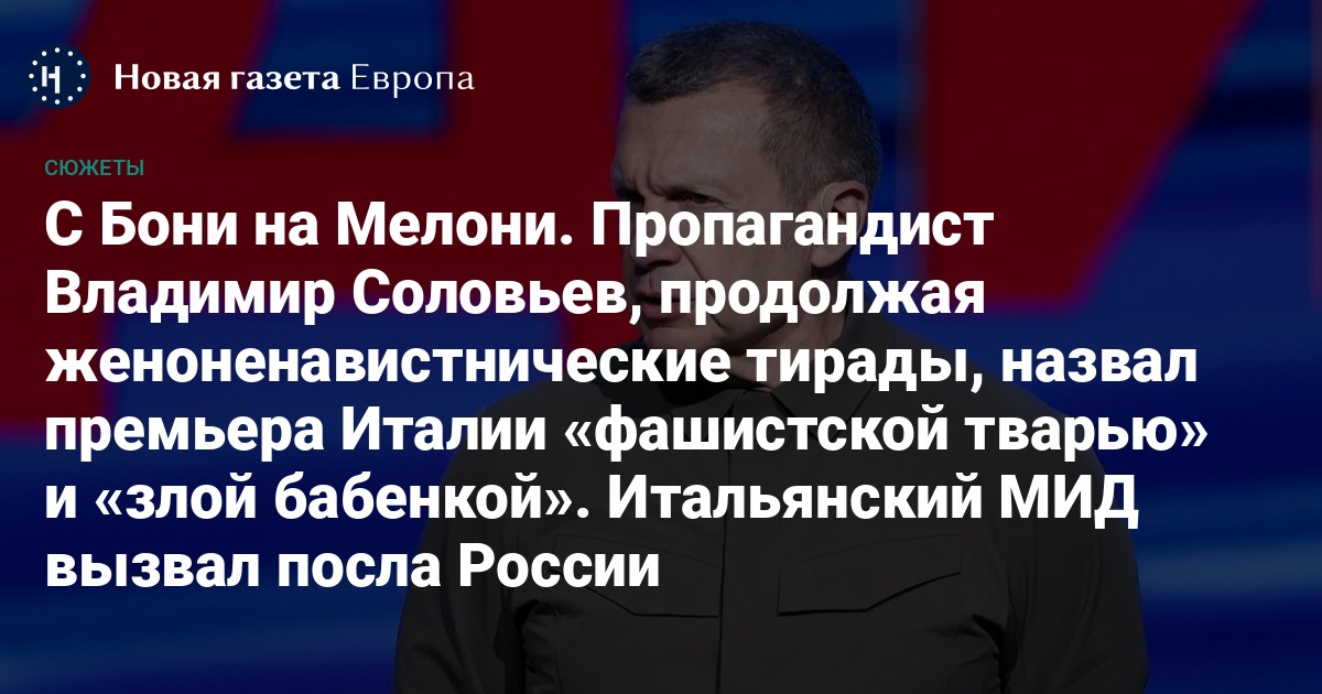 Пропагандист Владимир Соловьев, продолжая женоненавистнические тирады, назвал премьера Италии «фашистской тварью» и «злой бабенкой». Итальянский МИД вызвал посла России