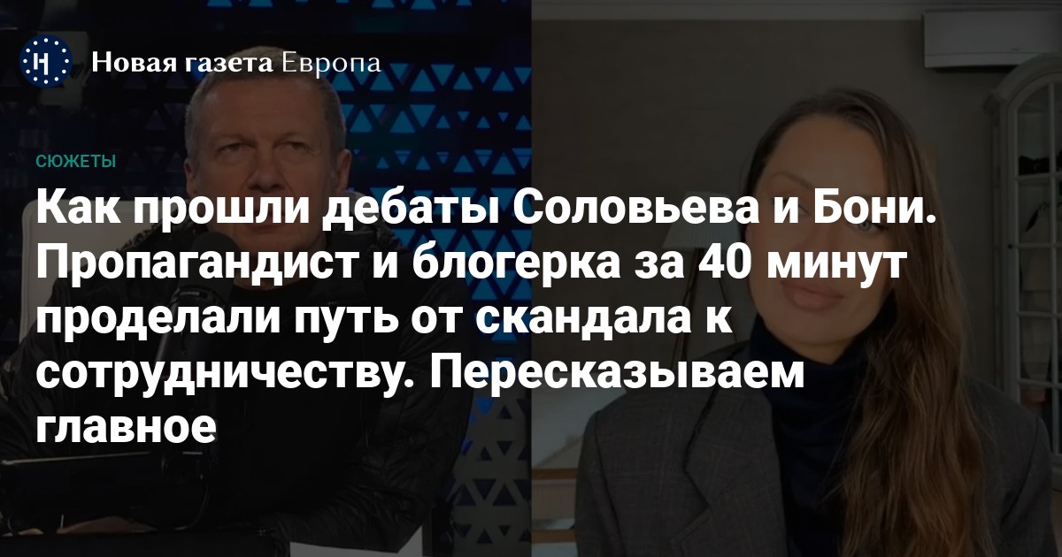 Дебаты начались с того, что Виктория Боня напомнила предысторию: ее обращение к Путину, которое собрало миллионы просмотров, вызвало со стороны Соловьева поток оскорблений (как писала «Новая-Европа», он называл ее «потрепанной шалавой» и «агентом Зеленского»).